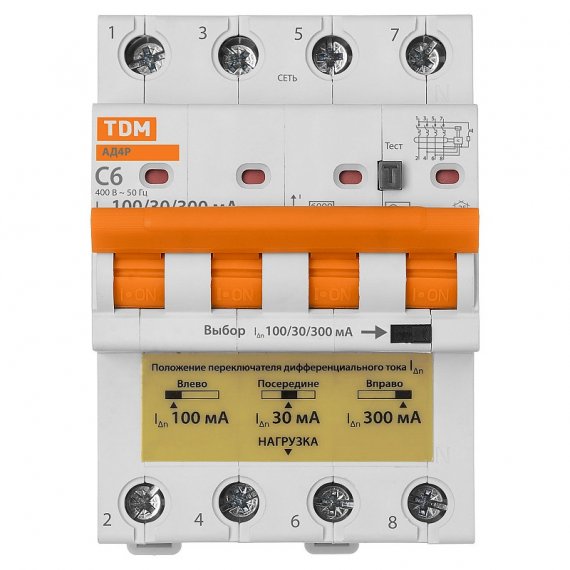 Tdm SQ0204-0627 Диф.автомат АД4P 4Р С6 30-100-300мА 6кА тип АС
