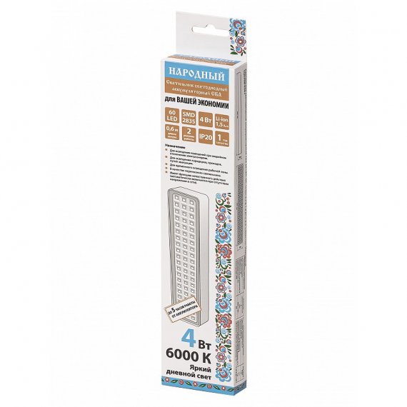 Светильник светодиодный аккумуляторный СБА 60 LED, DC, Li-ion 3,7 В 1,5 А*ч, 3-5 ч,пластик, Народный