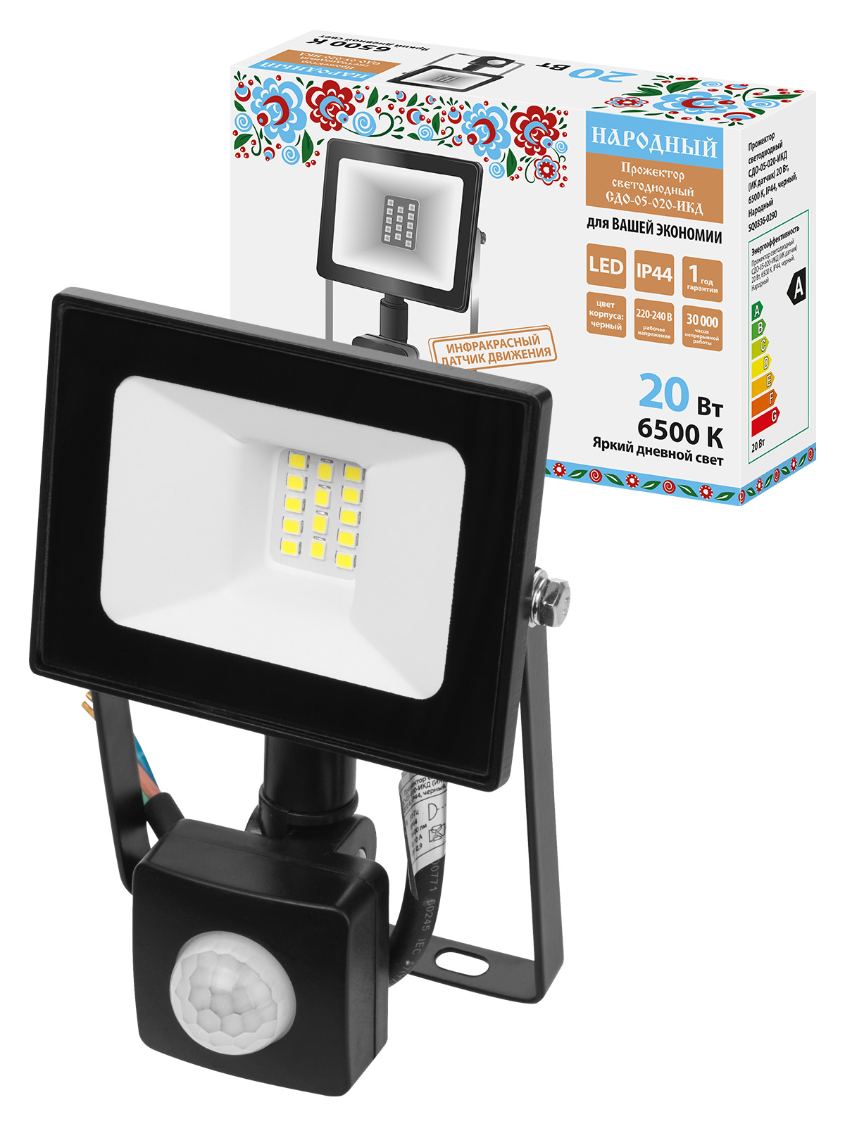 Прожектор СДО-05-020-ИКД (ИК датчик) 20 Вт, 1600 лм, 6500 К, 220-240 В, IP44, черный, Народный
