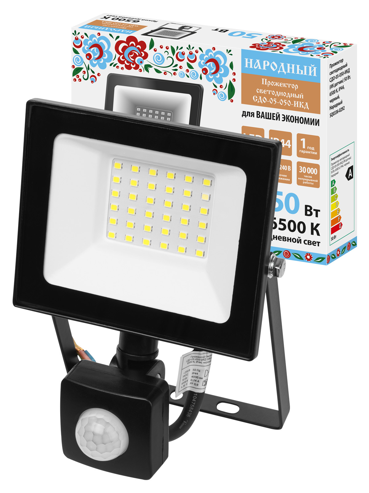Прожектор СДО-05-050-ИКД (ИК датчик) 50 Вт, 4000 лм, 6500 К, 220-240 В, IP44, черный, Народный