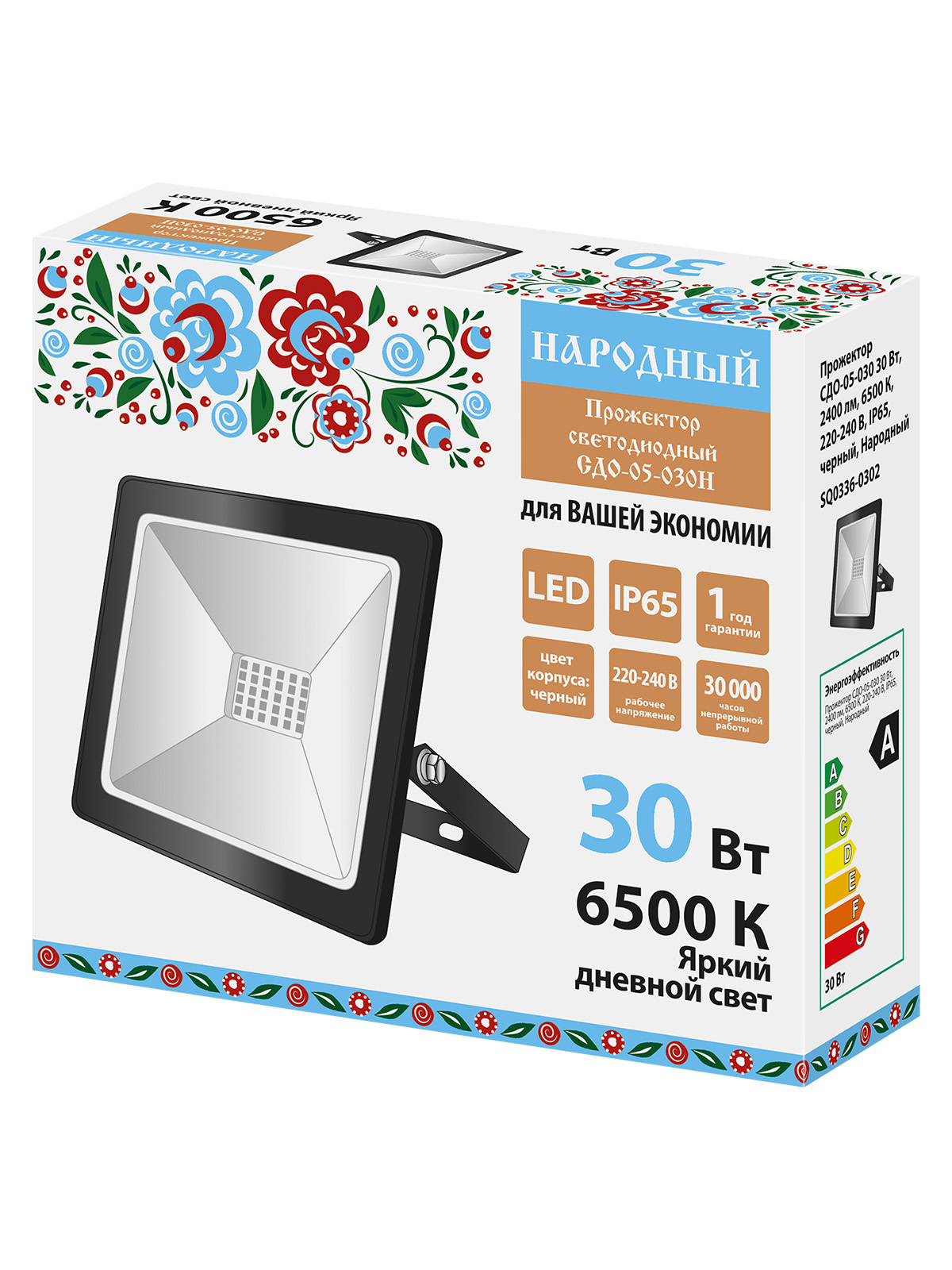 Прожектор СДО-05-030 30 Вт, 2400 лм, 6500 К, 220-240 В, IP65, черный, Народный