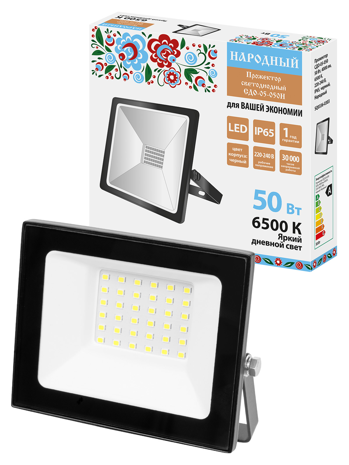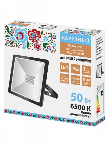 Прожектор СДО-05-050 50 Вт, 4000 лм, 6500 К, 220-240 В, IP65, черный, Народный