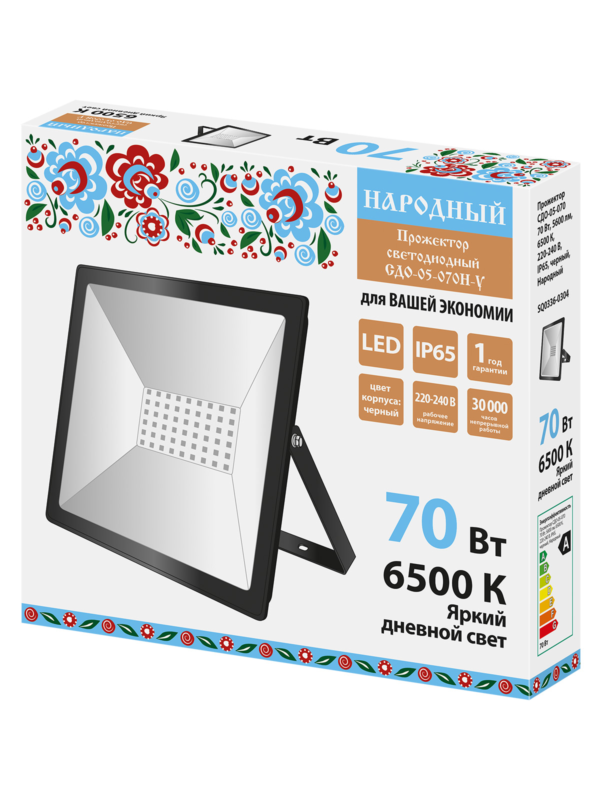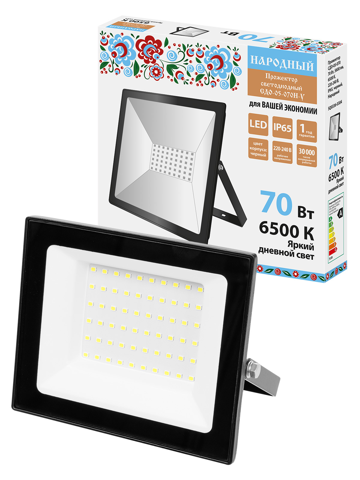 Прожектор СДО-05-070 70 Вт, 5600 лм, 6500 К, 220-240 В, IP65, черный, Народный