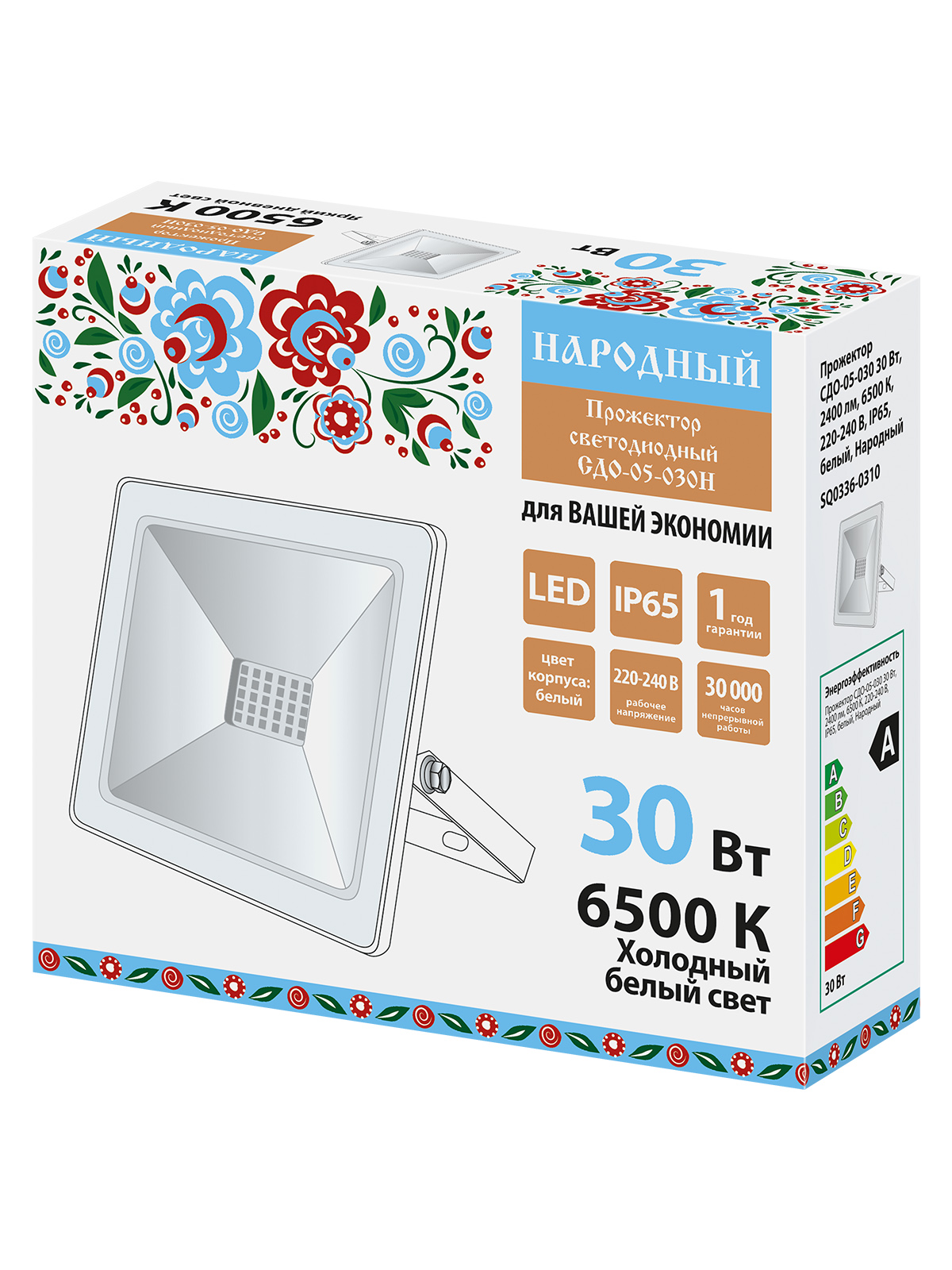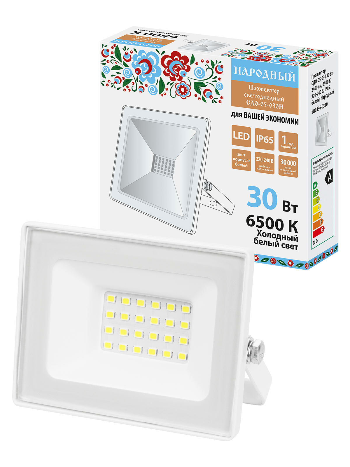 Прожектор СДО-05-030 30 Вт, 2400 лм, 6500 К, 220-240 В, IP65, белый, Народный