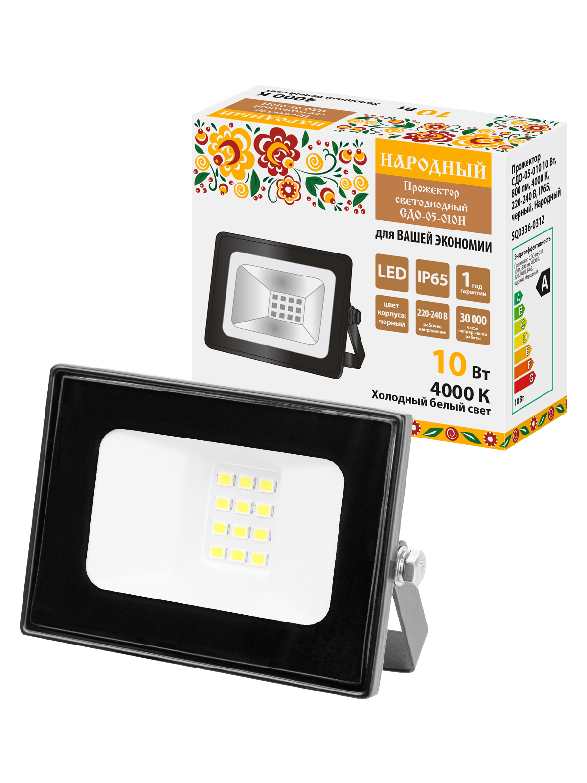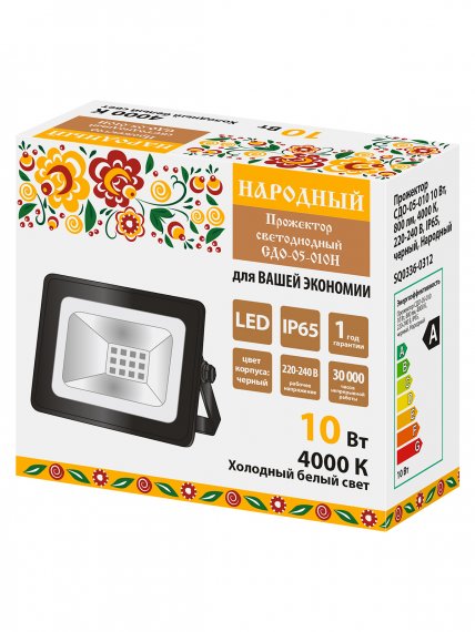 Прожектор СДО-05-010 10 Вт, 800 лм, 4000 К, 220-240 В, IP65, черный, Народный