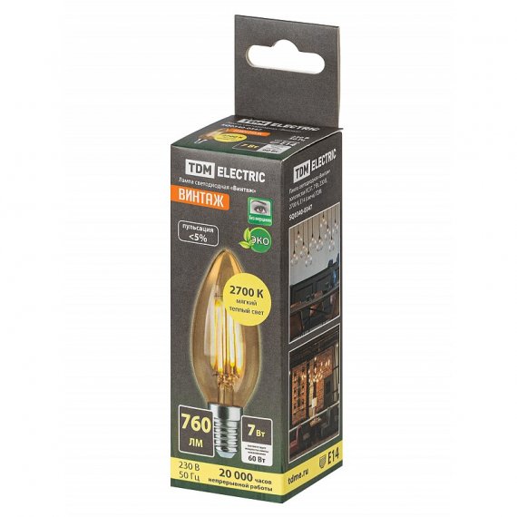 Лампа светодиодная "Винтаж" золотистая FC37 от TDM - это отличный выбор для тех, кто ценит уют и комфорт в своем доме. Она обладает мощностью 7 Вт, цветовой температурой 2700 К и цоколем типа E14. Благодаря своей форме колбы в виде свечи, эта лампа прекрасно подойдет для использования в различных интерьерах.