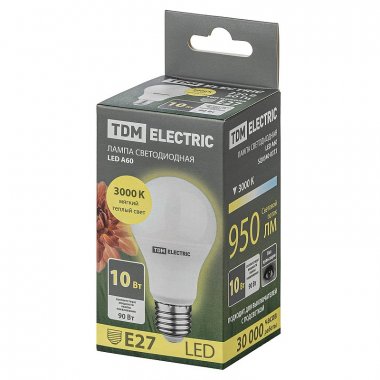 Светодиодная лампа А60 10 Вт, 3000 К, E27 от TDM - это отличный выбор для общего освещения и декоративной подсветки. Она подходит для всех типов светильников с патроном E27 и является энергоэффективной заменой ламп накаливания и люминесцентных ламп. Лампа имеет форму колбы A60 и матовый рассеиватель, выполненный из качественного термостойкого пластика.