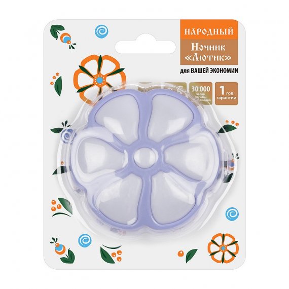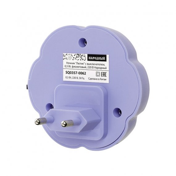 Ночник Лютик от Народной - это стильный и функциональный аксессуар для вашего дома. Мощность всего 0.5 Вт, но при этом обеспечивает достаточно света для комфортного пребывания в помещении. Фиолетовый цвет корпуса добавляет изюминку в интерьер, а наличие выключателя делает использование ночника еще более удобным.