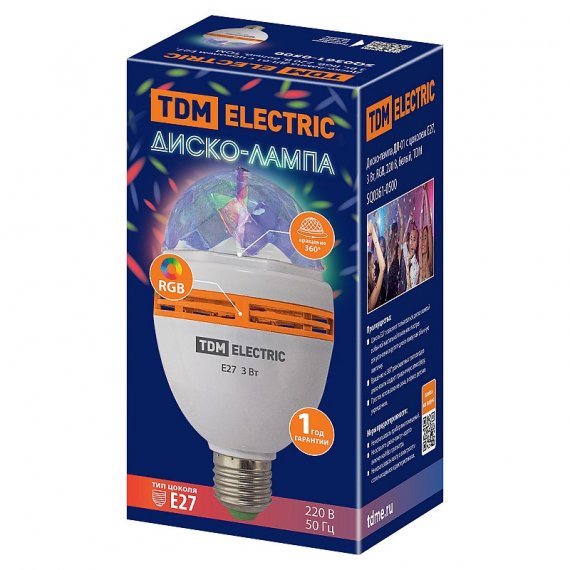 Купить по низким ценам Tdm SQ0361-0500 Описание Tdm SQ0361-0500 Диско-лампа ДЛ-01 от TDM - это светодиодная лампа с цоколем Е27 и мощностью 3 Вт. Она способна менять цвет благодаря функции RGB и работает от сети 220 В. Эта лампа идеально подойдет для создания праздничного настроения в любом помещении. Гарантия на продукт составляет 1 год.
