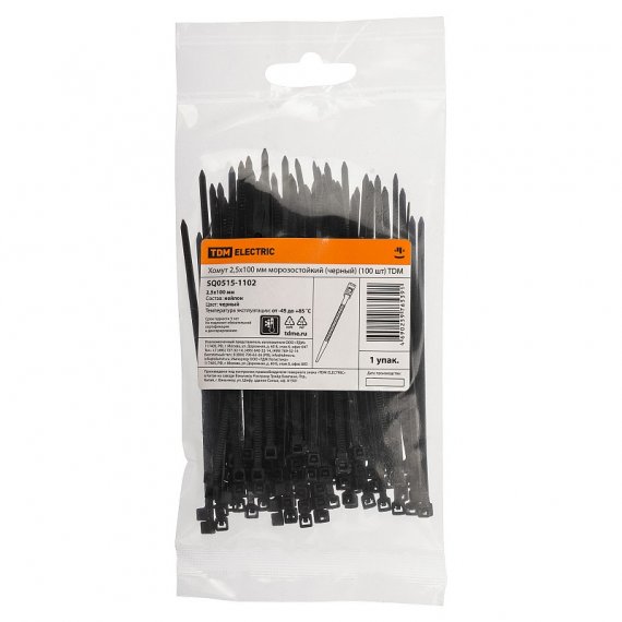 Хомут морозостойкий 2.5х100 мм от TDM - надежное решение для увязки кабелей и проводов при проведении электромонтажных работ в условиях низких температур до -45 °С. Этот продукт выполнен из нейлона 6.6 с добавками, которые позволяют сохранить его свойства даже при холодных температурах.