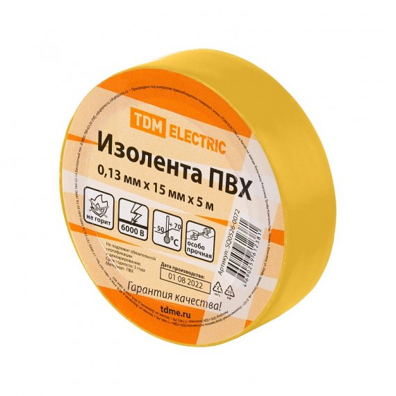Изолента ПВХ 0,13х15мм Желтая 5м TDM - это надежный помощник при ремонте и сращивании электрокабелей с неметаллическими оболочками. Материал изоленты - ПВХ пленка с клеевым слоем на основе каучука, что обеспечивает долговечность и прочность соединения. Ширина ленты составляет 15 мм, длина - 5 м, толщина - 0.13 мм. Изолента представлена в желтом цвете и относится к серии SQ0526-007.