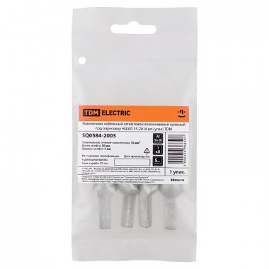 Наконечник кабельный штифтовой алюминиевый луженый НШАЛ 35-20 от TDM предназначен для оконцевания опрессовкой алюминиевых жил кабелей и проводов. Он позволяет подключать алюминиевую жилу провода СИП непосредственно к электротехническим устройствам.