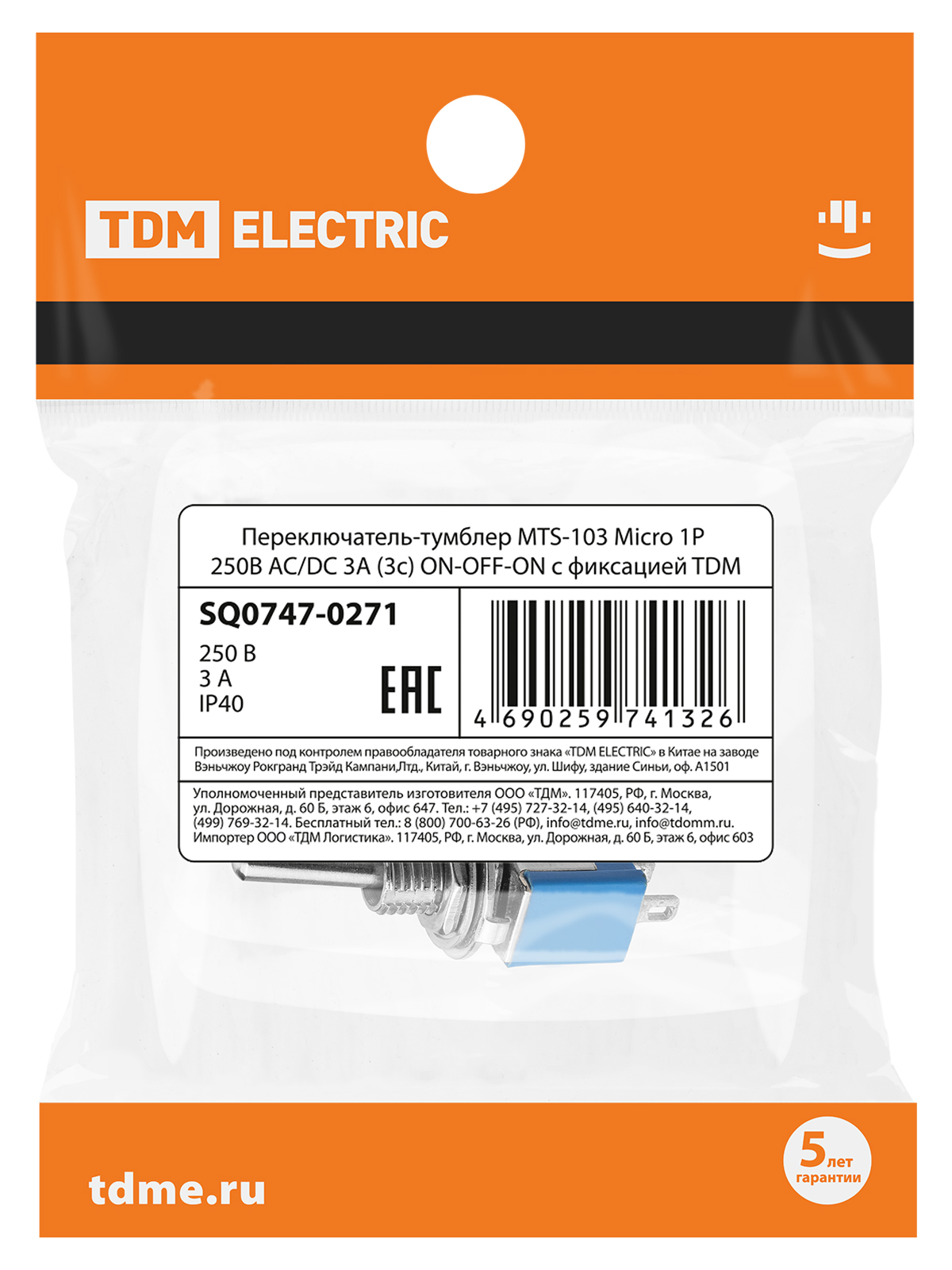 Tdm SQ0747-0271 Переключатель-тумблер MTS-103 Micro 1P 250В AC/DC 3А (3c) ON-OFF-ON