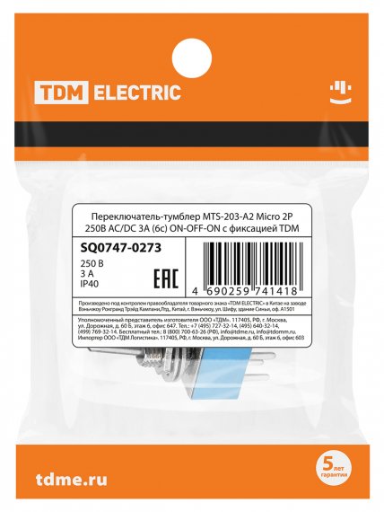 Tdm SQ0747-0273 Переключатель-тумблер MTS-203-A2 Micro 2P 250В AC/DC 3А (6c) ON-OFF-ON