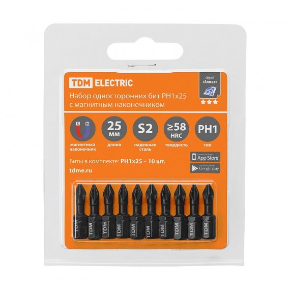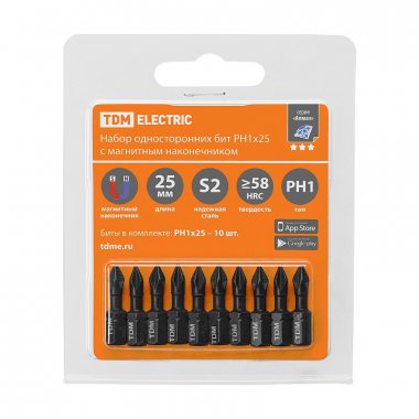 Набор бит PH1x25, односторонних, сталь S2, Е 1/4", намагниченные, торсионные, 10 шт., «Алмаз» TDM