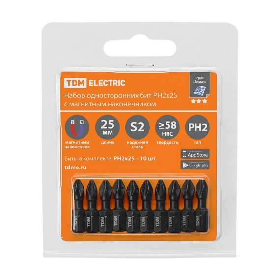 Набор бит PH2x25, односторонних, сталь S2, Е 1/4", намагниченные, торсионные, 10 шт., «Алмаз» TDM
