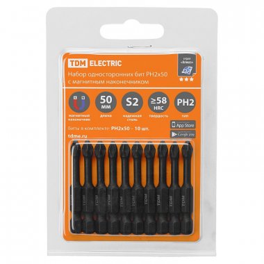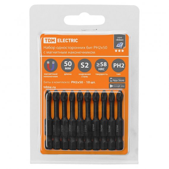 Набор бит PH2x50, односторонних, сталь S2, Е 1/4", намагниченные, торсионные, 10 шт., «Алмаз» TDM