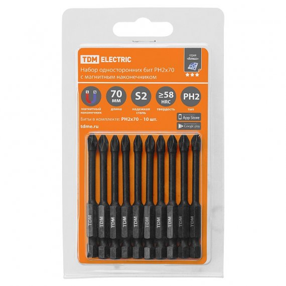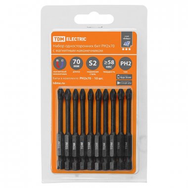 Набор бит PH2x70, односторонних, сталь S2, Е 1/4", намагниченные, торсионные, 10 шт., «Алмаз» TDM