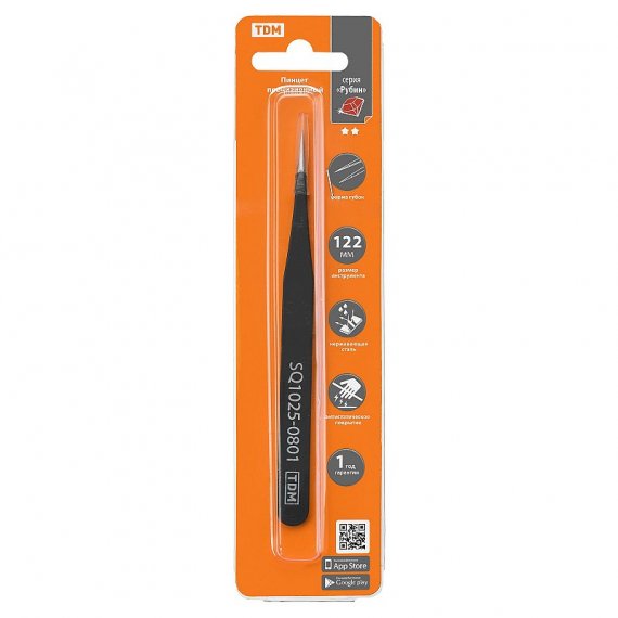 Пинцет прецизионный прямой 122 мм, острое жало, нерж., антистатич. покр., блистер, "Рубин" TDM