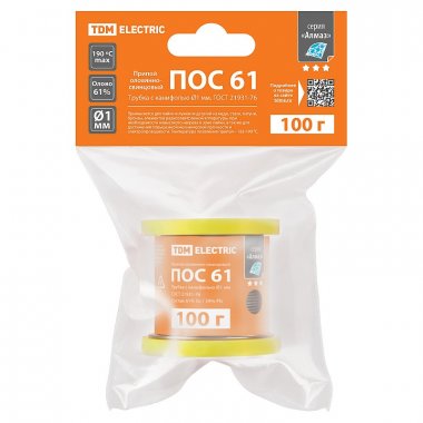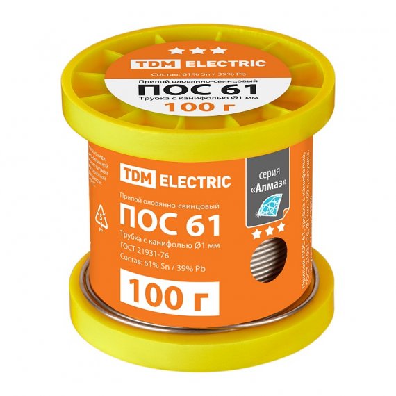 Припой ПОС 61, трубка с канифолью, ГОСТ 21931-76, ?1 мм, 100 г, катушка, инд. упак., "Алмаз" TDM
