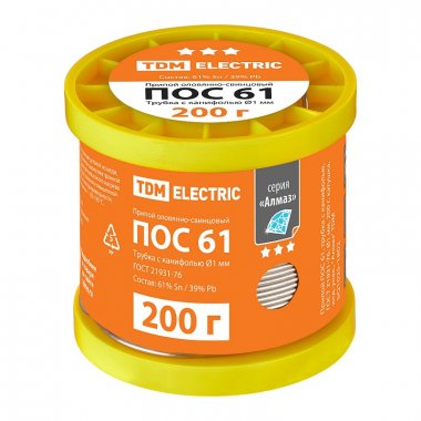 Припой ПОС 61, трубка с канифолью, ГОСТ 21931-76, ?1 мм, 200 г, катушка, инд. упак., "Алмаз" TDM