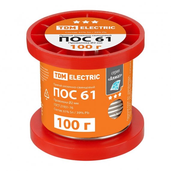 Припой ПОС 61, проволока, ГОСТ 21931-76, ?2 мм, 100 г, катушка,, инд. упак., "Алмаз" TDM