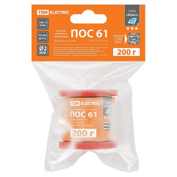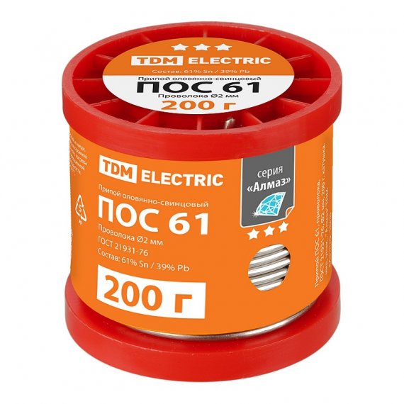 Припой ПОС 61, проволока, ГОСТ 21931-76, ?2 мм, 200 г, катушка, инд. упак., "Алмаз" TDM