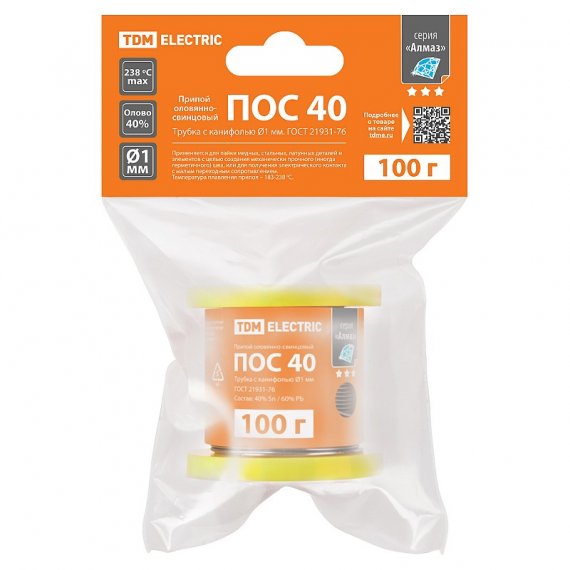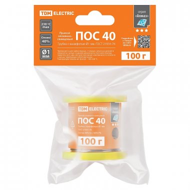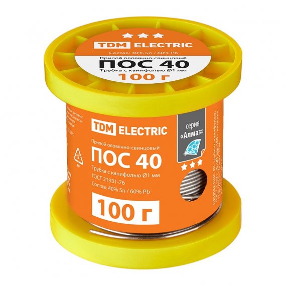 Припой ПОС 40, трубка с канифолью, ГОСТ 21931-76, ?1 мм, 100 г, катушка, инд. упак., "Алмаз" TDM