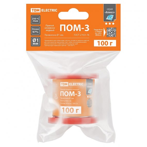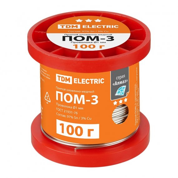Припой ПОМ-3, проволока, ГОСТ 21931-76, ?1 мм, 100 г, катушка, инд. упак., "Алмаз" TDM