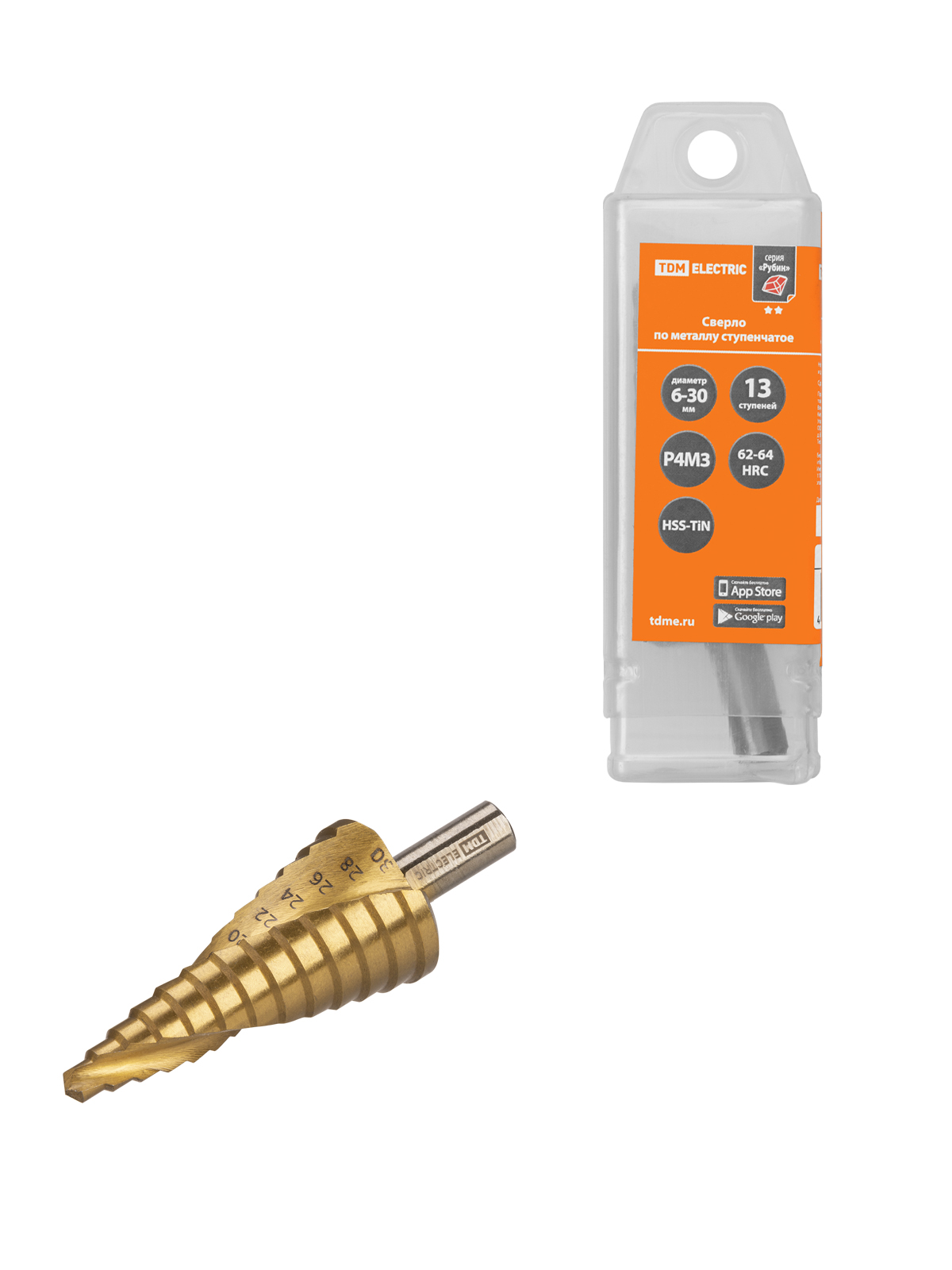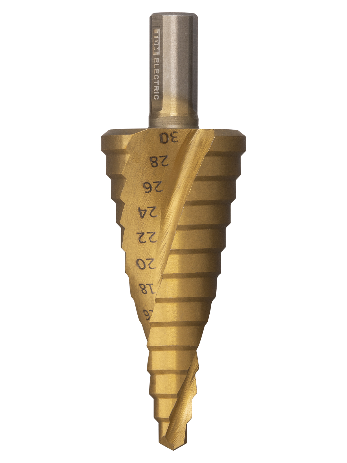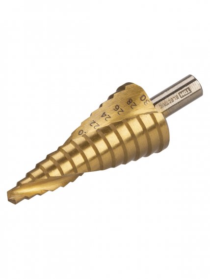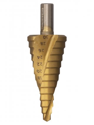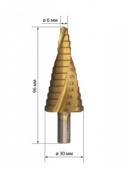 Сверло по металлу ступенчатое, 6-30 мм, 13 ступеней, нитрид., HSS, цилиндр. хв., "Рубин" TDM