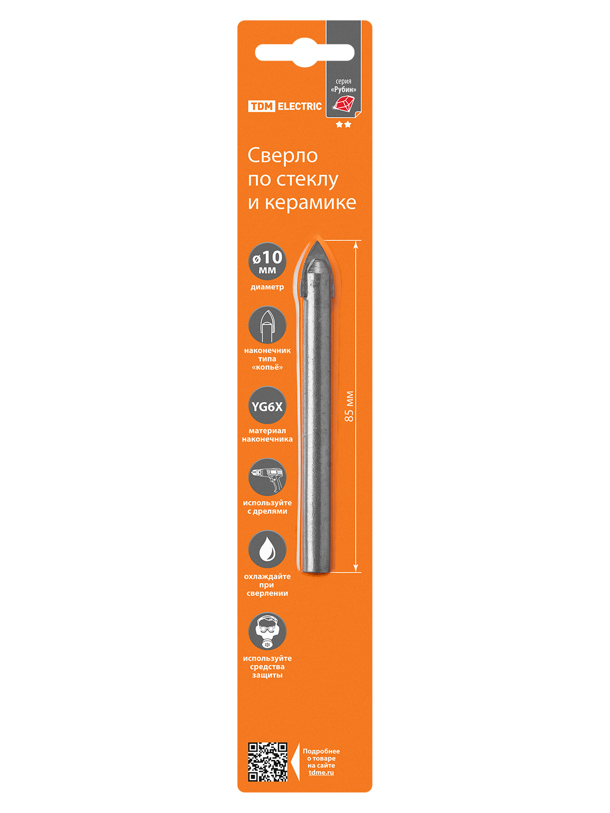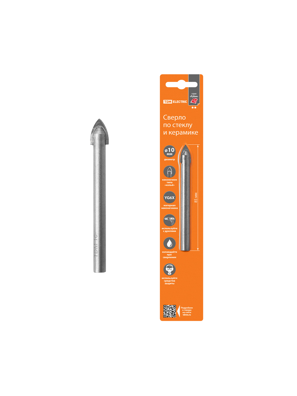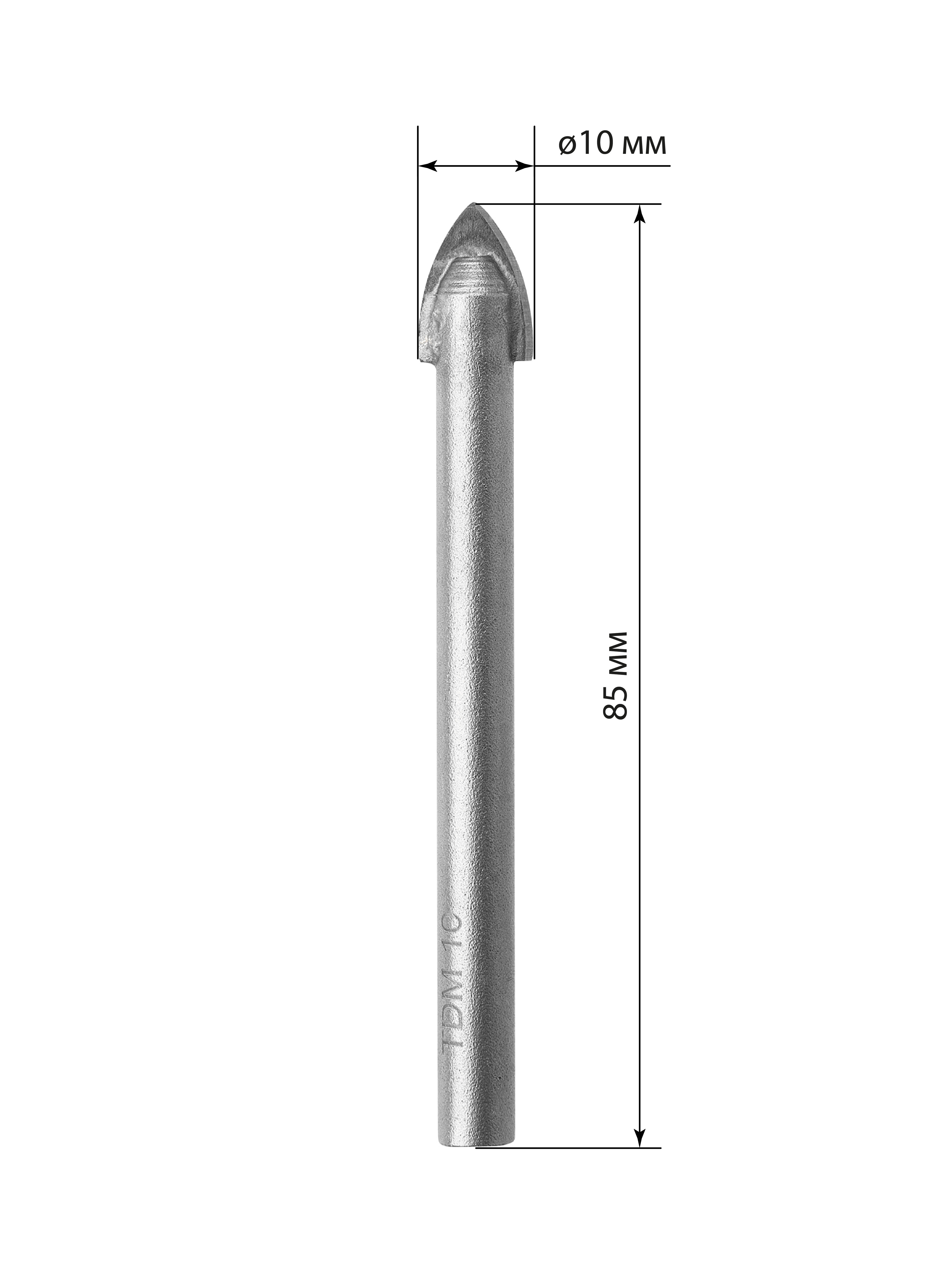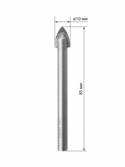 Сверло по стеклу и керамике 10×85 мм, 2 реж., лезвия, цилиндр. хв., блистер 1 шт, "Рубин" TDM