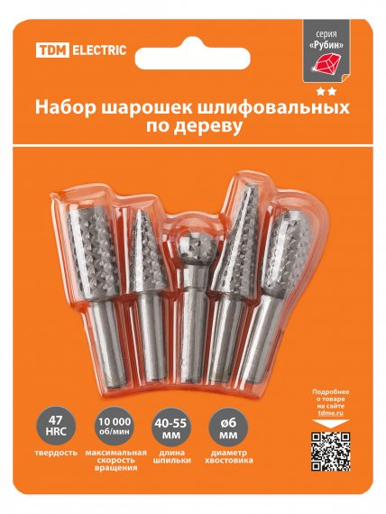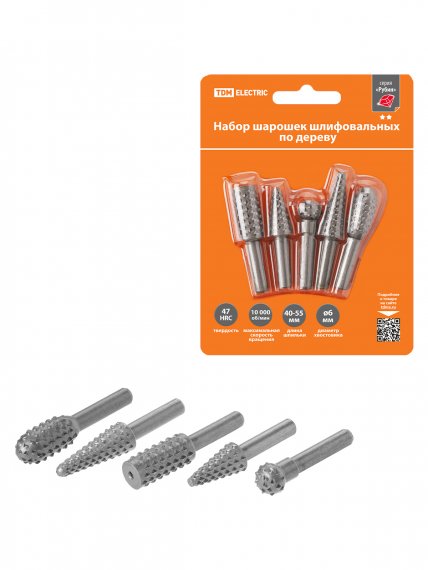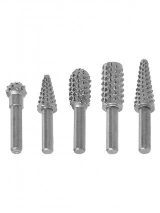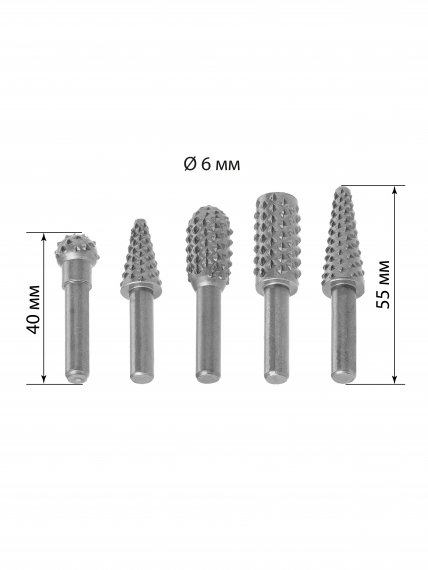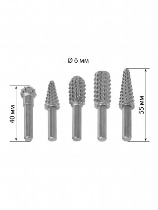 Набор шарошек шлифовальных, рашпильных, Ø 6 мм, L 40-55 мм, по дереву, 5 шт, "Рубин" TDM
