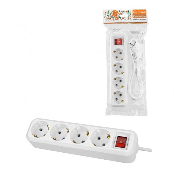 Удлинитель 4 гнезда, 3 метра, с/з, выкл., 10 А, 2300 Вт, белый, НАРОДНЫЙ