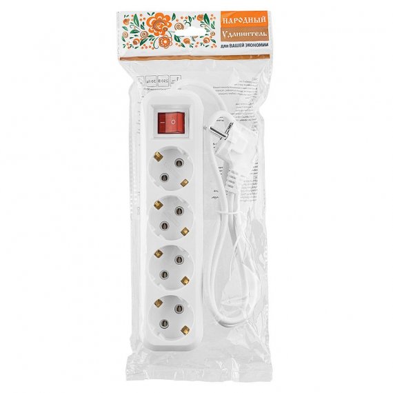 Удлинитель 4 гнезда, 7 метров, с/з, выкл., 10 А, 2300 Вт, белый, НАРОДНЫЙ