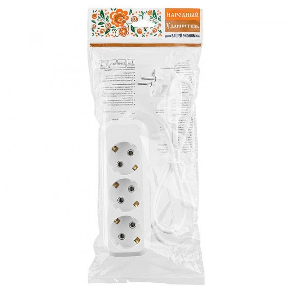 Удлинитель 3 гнезда, 10 метров, с/з, 16 А, 3680 Вт, белый, НАРОДНЫЙ