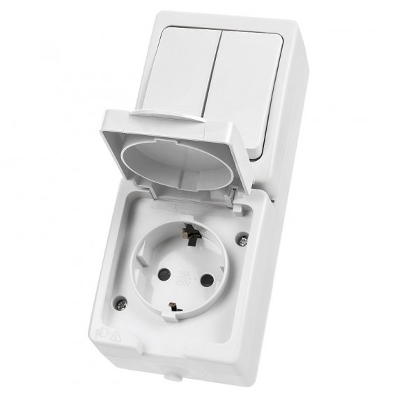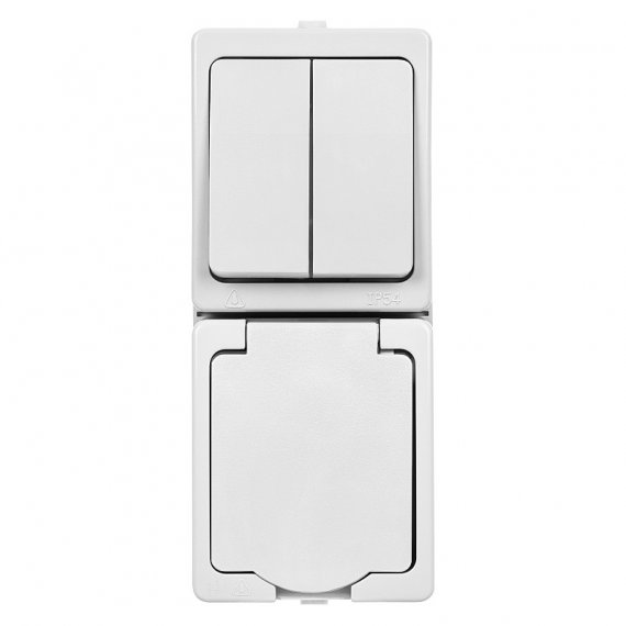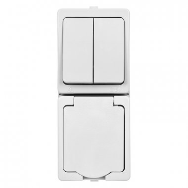 Блок (вертикальный) выключатель 2-кл. + розетка 2П+З с з/ш БКВР IP54 белый "Вуокса" TDM