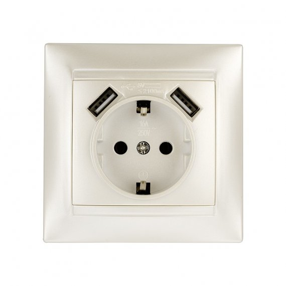 Розетка 2П+З 16А 250В + 2 USB порта 2,1А 5В перламутр "Лама" TDM